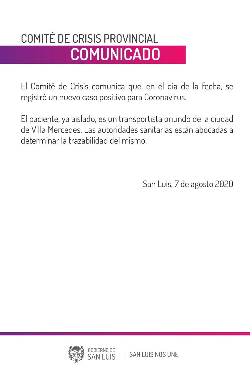 “El paciente, ya aislado, es un transportistas oriundo de Villa Mercedes. Las autoridades sanitarias están abocadas a determinar la trazabilidad del mismo”.dice el escueto informe hasta el momento.