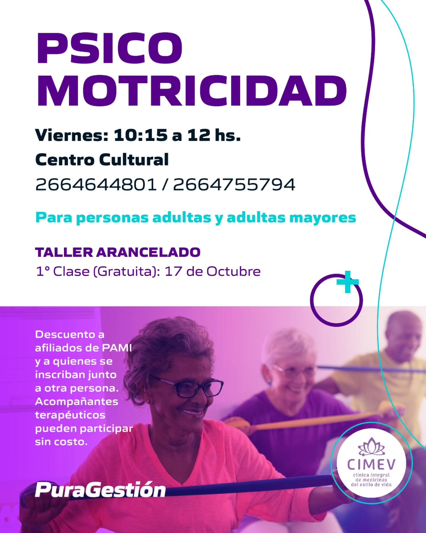 Junto a CIMEV (Clínica Integral de Medicinas del Estilo de Vida), el municipio invita a participar del Taller de Psicomotricidad, los días viernes de 10:15 a 12:00 horas en nuestro Centro Cultural, (Av. del Viento Chorrillero 2573).