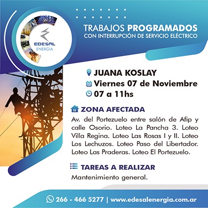 EDESAL informó que habrá corte programado del servicio eléctrico este viernes 07 de noviembre en zonas de nuestra ciudad.