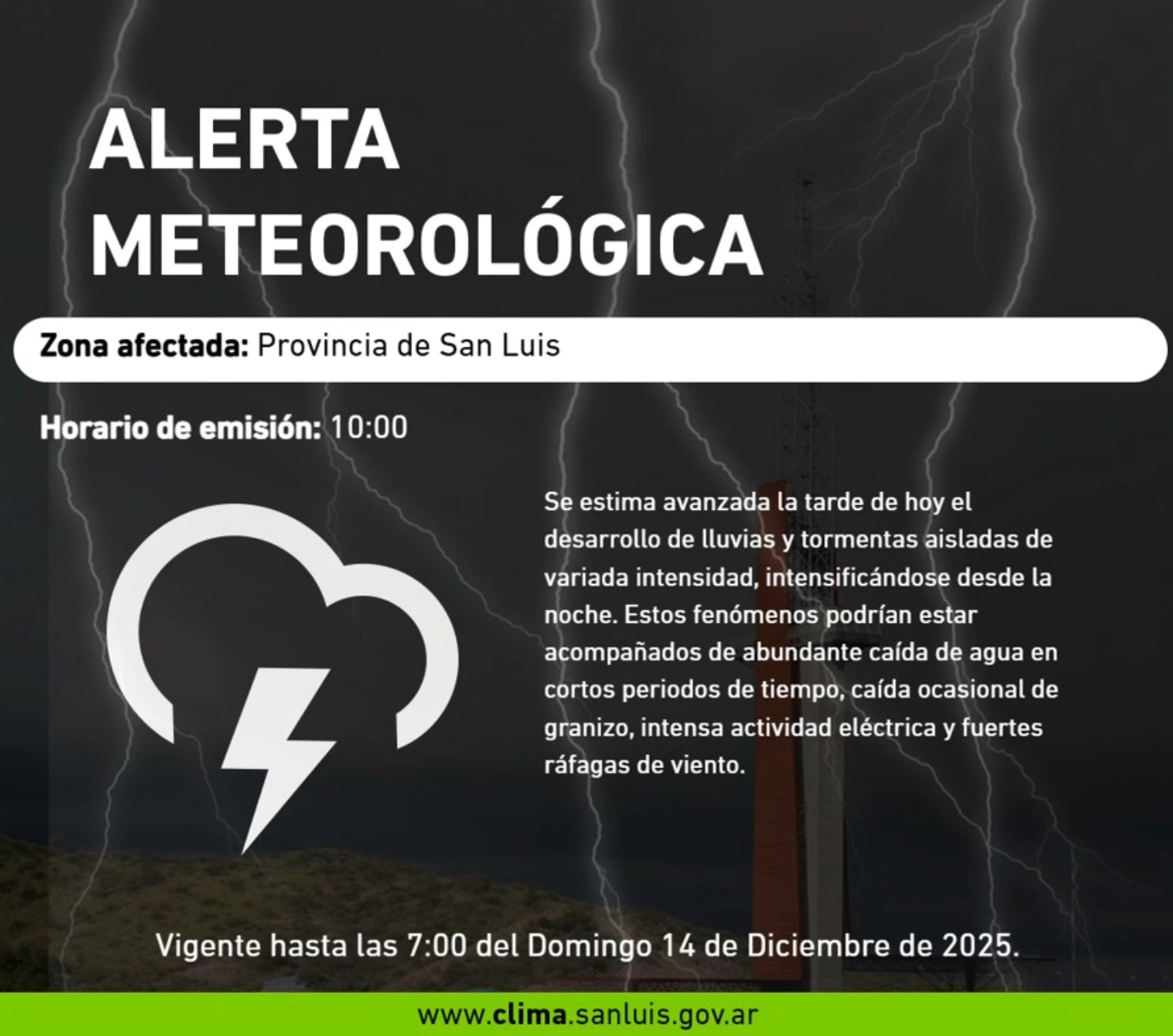 Estos fenómenos podrían estar acompañados de abundante caída de agua en cortos periodos de tiempo, caída ocasional de granizo, intensa actividad eléctrica y fuertes ráfagas de viento.