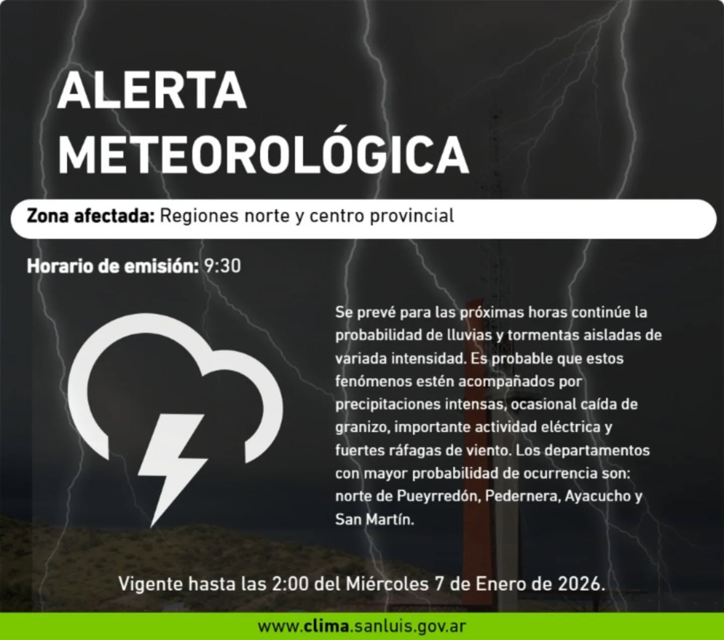 Se prevé para las próximas horas continúe la probabilidad de lluvias y tormentas aisladas de variada intensidad. Es probable que estos fenómenos estén acompañados por precipitaciones intensas, ocasional caída de granizo, importante actividad eléctrica y fuertes ráfagas de viento. Los departamentos con mayor probabilidad de ocurrencia son: norte de Pueyrredón, Pedernera, Ayacucho y San Martín.
