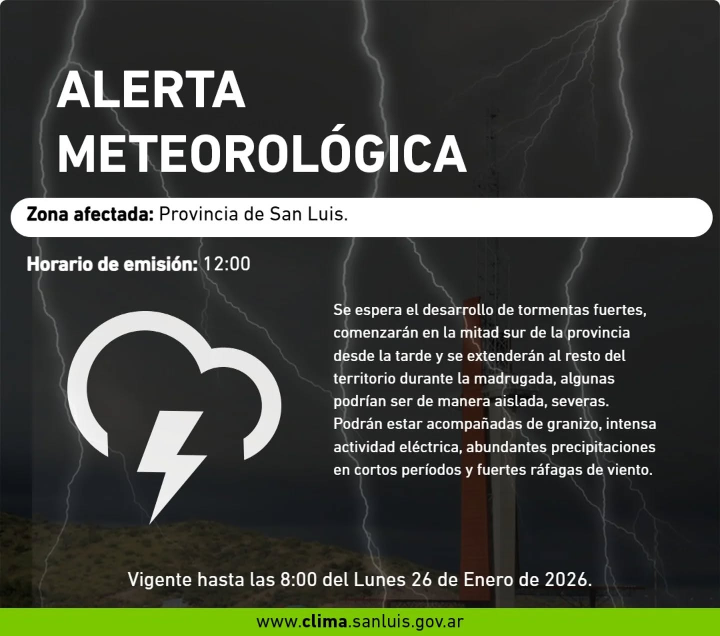 Se espera el desarrollo de tormentas fuertes, comenzarán en la mitad sur de la provincia desde la tarde y se extenderán al resto del territorio durante la madrugada, algunas podrían ser de manera aislada, severas. Podrán estar acompañadas de granizo, intensa actividad eléctrica, abundantes precipitaciones en cortos períodos y fuertes ráfagas de viento.