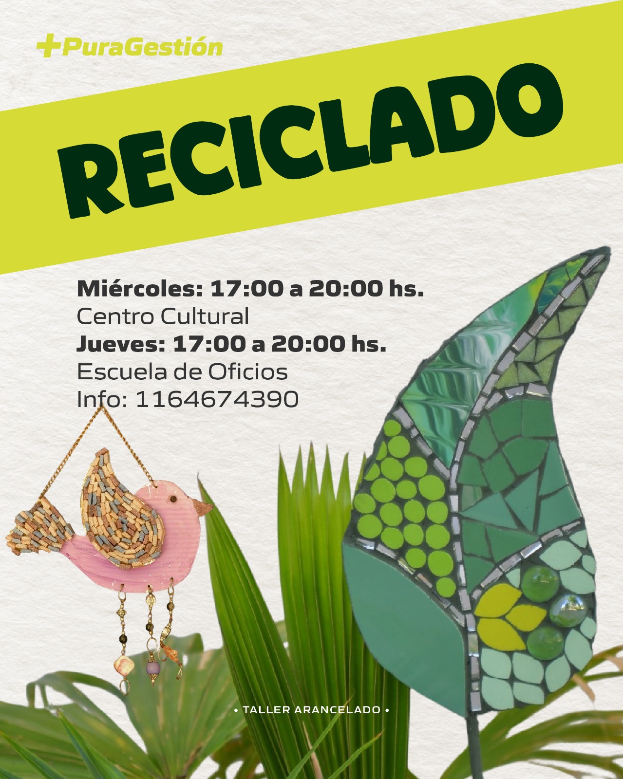 La propuesta se desarrolla en dos espacios de la ciudad: los miércoles de 17 a 20 horas en el Centro Cultural y los jueves, en el mismo horario, en la Escuela de Oficios. Se trata de un taller arancelado, pensado tanto para quienes buscan incorporar hábitos responsables como para aquellos que desean adquirir herramientas prácticas vinculadas al reciclaje y la economía circular. Para más información e inscripciones, las consultas pueden realizarse al 1164674390.