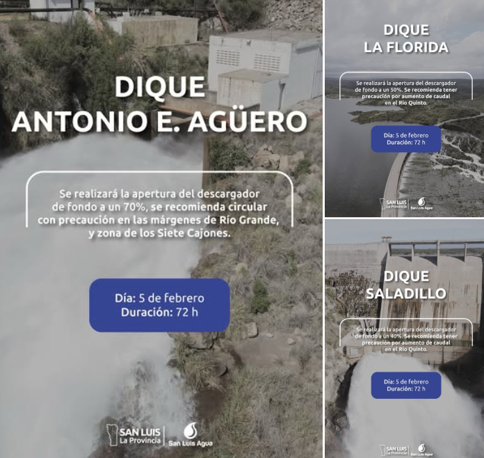 Les informamos que, debido a las lluvias registradas en los últimos días, San Luis Agua se encuentra trabajando en la apertura del descargador de fondo de los diques que proveen el agua cruda.