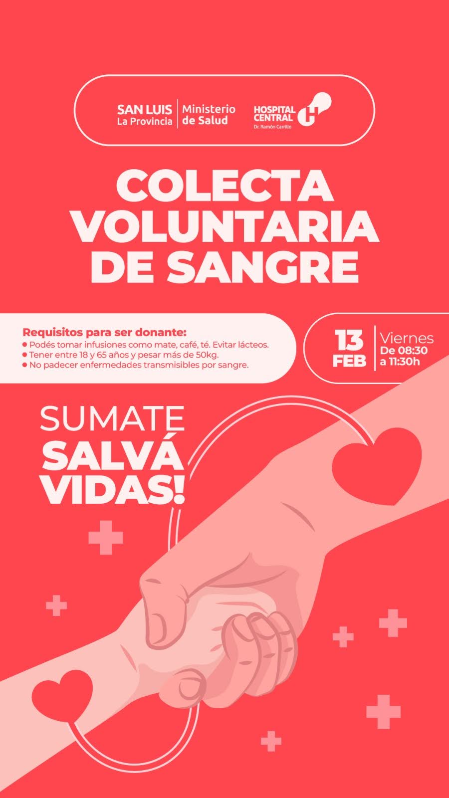 El Sistema Público de Salud convoca a la comunidad sanluiseña a participar de una nueva jornada de donación de sangre este viernes 13 en el Hospital Central ‘Doctor Ramón Carrillo’ (HCRC), de 8:30 a 11:30, en el hall principal. La iniciativa, organizada por el Servicio de Hemoterapia, busca garantizar un stock adecuado de sangre y hemoderivados, elementos vitales para emergencias, cirugías y tratamientos médicos urgentes.