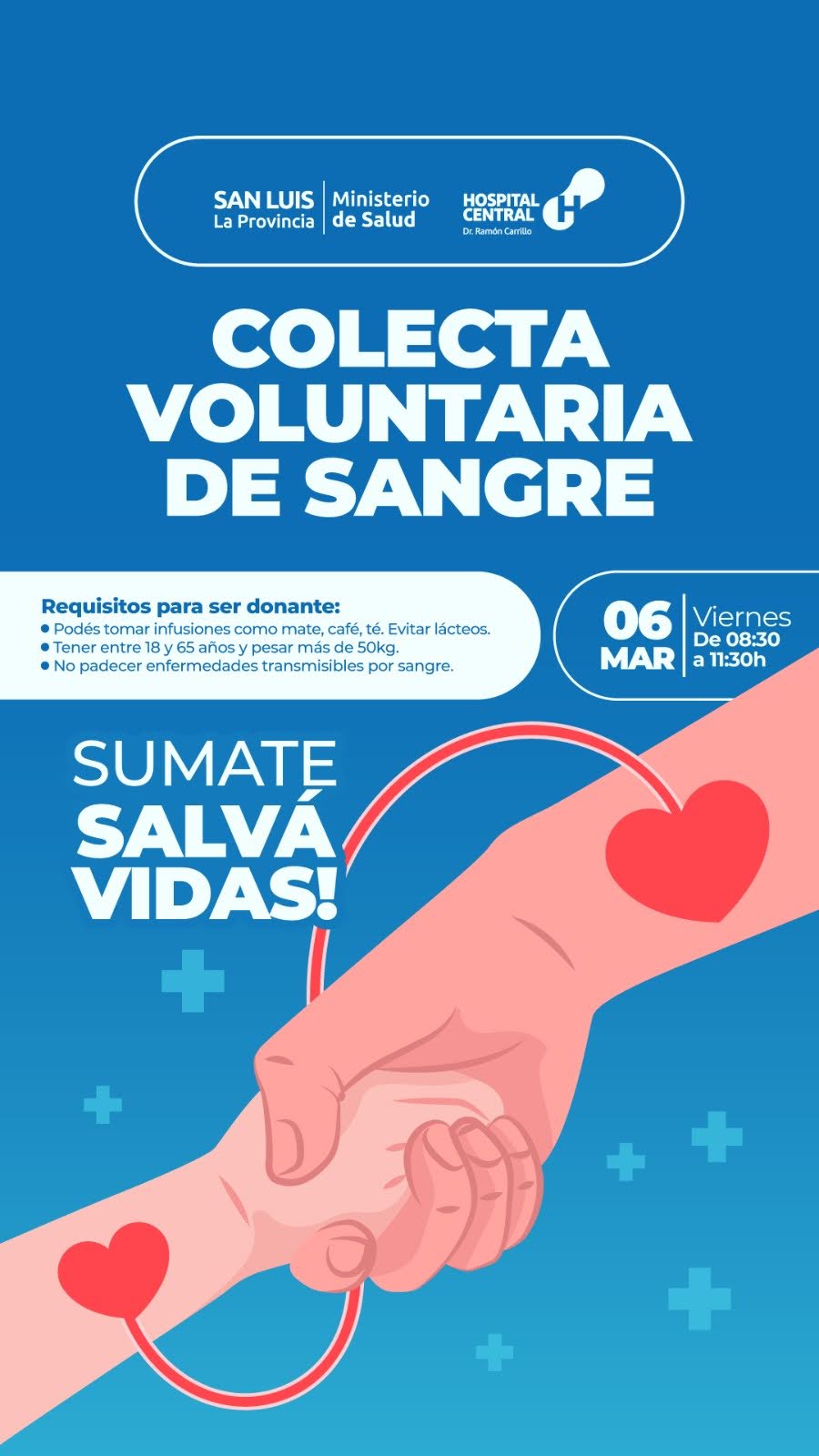 El sistema público de salud, a través del Hospital Central ‘Dr. Ramón Carrillo’, invita a la comunidad a participar en una nueva jornada de donación de sangre este viernes, en el hall principal del establecimiento, de 8:30 a 11:30 horas. La actividad, organizada por el Servicio de Hemoterapia, busca mantener reservas suficientes de sangre y sus derivados, elementos indispensables para atender emergencias, intervenciones quirúrgicas y tratamientos de urgencia.