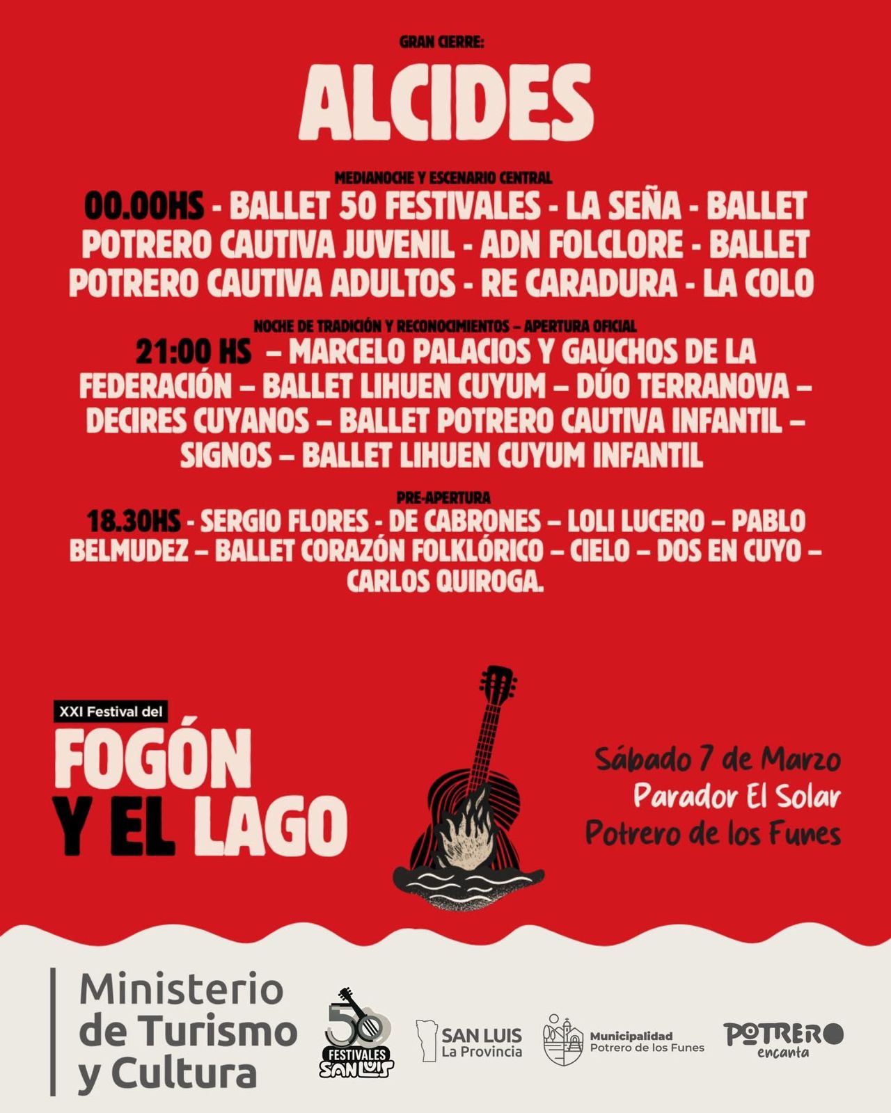 Este viernes en conferencia de prensa, Pablo Muñoz, director de Gestión Cultural e Identidad Sanluiseña, e Ignacio Morris, secretario de Turismo, Cultura y Deporte de Potrero, presentaron la grilla del XXI Festival del Fogón y el Lago. El evento, que será este sábado en el parador ‘El Solar’, comenzará a las 18:30 y será con entrada libre y gratuita.