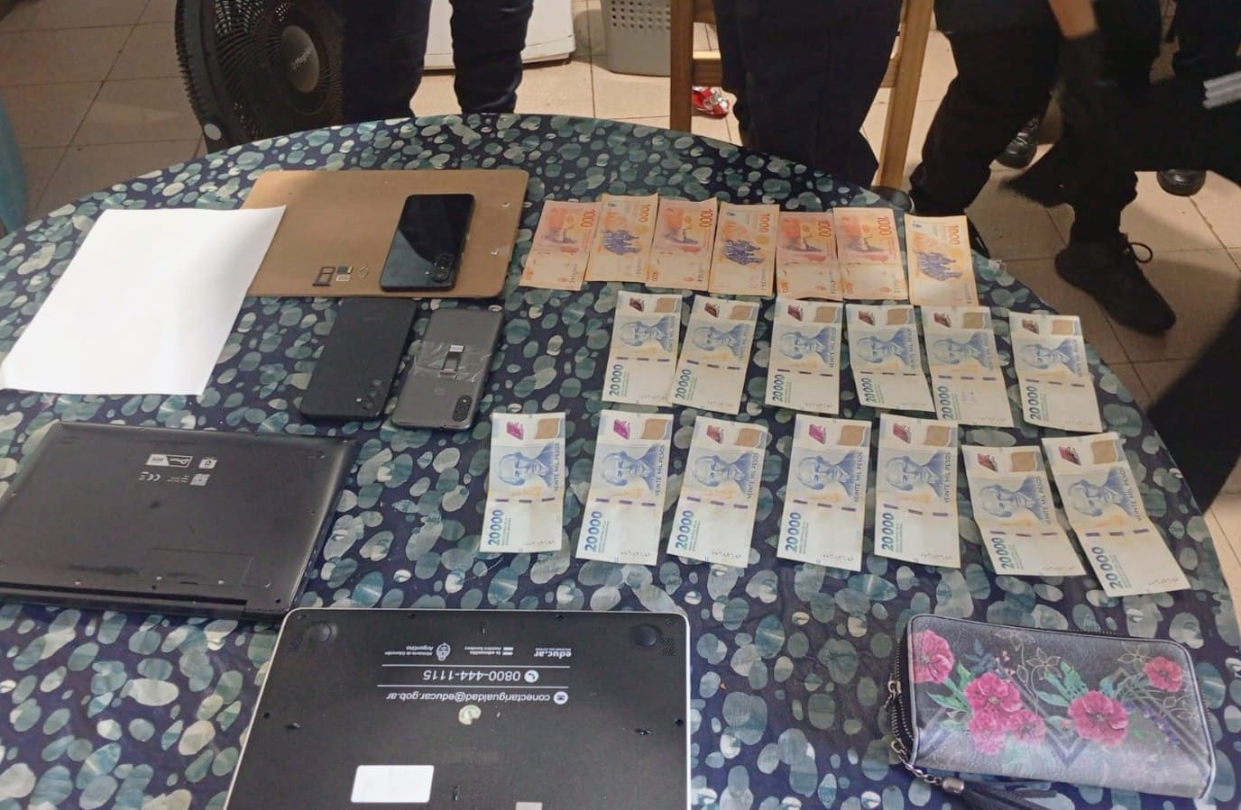 Tras los procedimientos, la Policía secuestró dinero falso, notebooks, una máquina contadora de billetes, tablets, un CPU, pendrives, una impresora, documentación vinculada a préstamos, varios teléfonos celulares, prendas de vestir y un automóvil Peugeot 405.