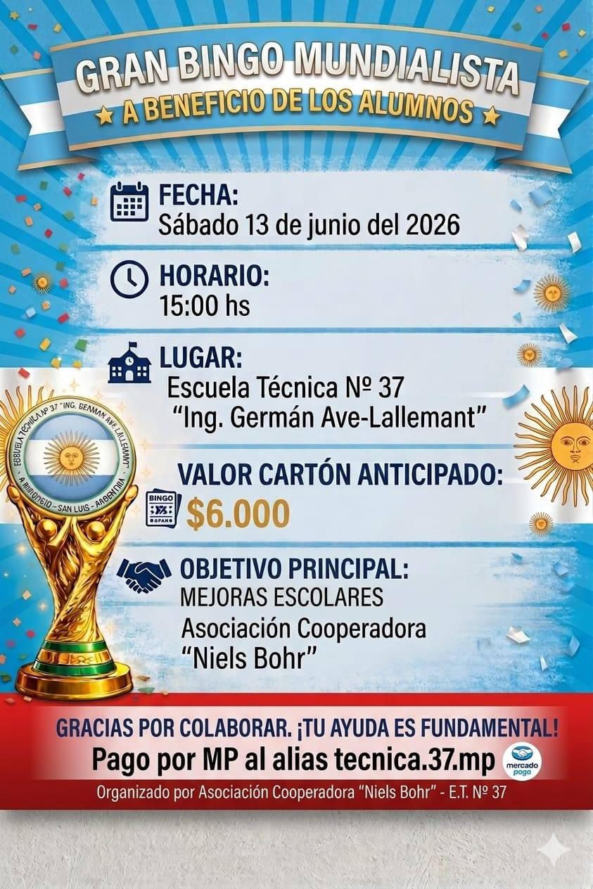 El denominado “Bingo Mundialista”, es una iniciativa cuya organización está a cargo de la Cooperadora “Niels Bohr”, y contará con la participación activa de tutores y tutoras, quienes estarán ofreciendo los cartones por curso para facilitar el acceso a toda la comunidad.